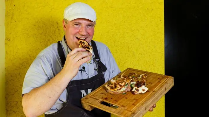 Aus der Pfanne nehmen, mit Parmaschinken, Mozzarella und Salat füllen, in der Mitte zuklappen.