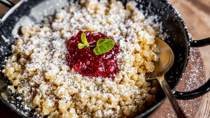 Gerne kann es mit Rosinen oder auch Heidelbeeren nach Wunsch verfeinert werden. In der Sattelberghütte wird es klassischerweise mit Preiselbeermarmelade serviert.