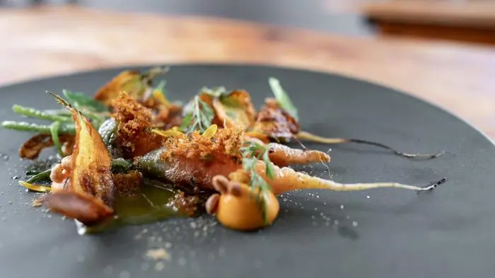 Karotten im Fond knackig kochen und eiskalt abschrecken. Karotten trocken tupfen.