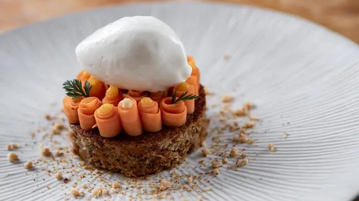 Mit Karottenstaub und Crumbles sowie Karottengrün nach Belieben garnieren.