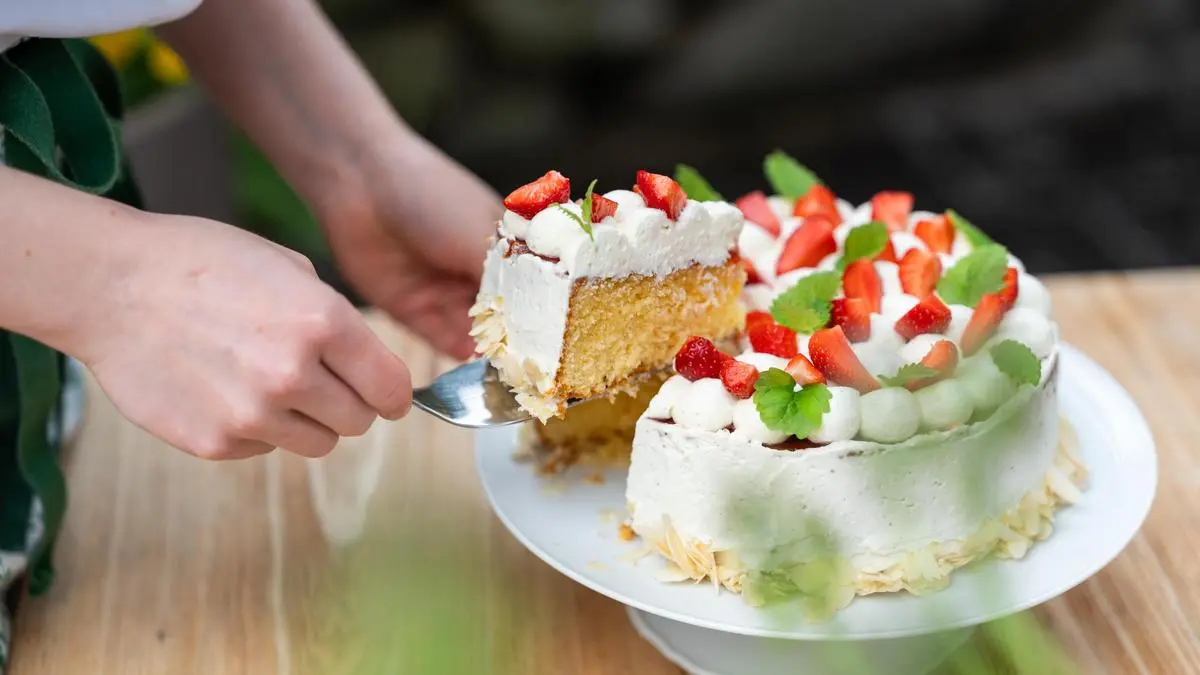 - Die Creme in einen Spritzsack mit einer großen Lochtülle füllen und auf den Kuchen aufdressieren. Mit geviertelten Erdbeeren und Minz- oder Zitronenmelissenblättern nach Belieben ausdekorieren.