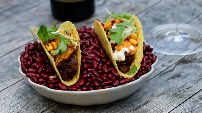 Die Mais-Tacos mit der Rindfleischmasse füllen, Essigzwiebel darauf geben und die restlichen Zutaten dekorativ auf den