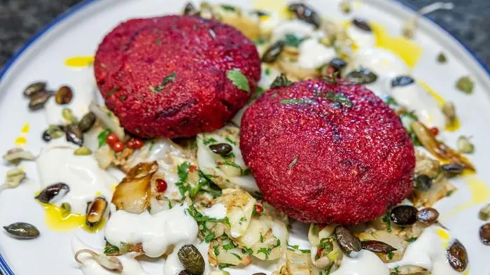 Auf Teller anrichten. Die fertigen Laibchen draufsetzen. Mit pflanzlicher Sauerrahmalternative, gerösteten Kürbiskernen und Sprossen garnieren. Zum Schluss mit Leinöl beträufeln.