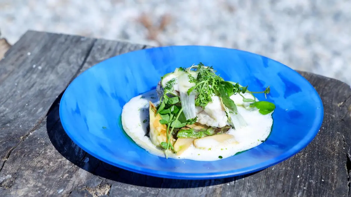 Zum Anrichten das Spargelgemüse als Basis auf den Teller geben, den Zander darauf platzieren, mit Beurre Blanc nappieren, den Wildkräuter-Spargel locker darauf setzen und mit Schnittlauchöl sowie frisch geschnittenem Schnittlauch vollenden.