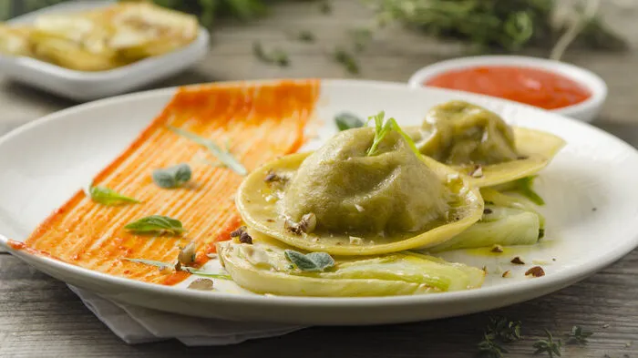 Ravioli gefüllt mit Beinfleisch, dazu Paprikacreme und Fenchel