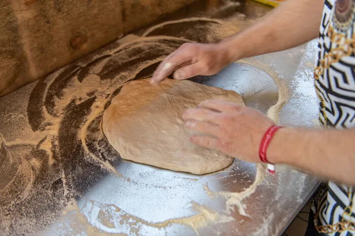 Nachdem der Teig den sogenannten "Cold Proof" durchgemacht hat, gibt man diesen 3 Stunden, bevor man die Pizza belegt, wieder in Raumtemperatur. Denn wenn der Teig zu kalt ist, lässt sich dieser sehr schwer von Hand austreiben.Um den Teig optimal zu formen, gibt man genügend Semola Rimacinata auf eine Arbeitsfläche und drückt sanft eine Vertiefung in die Mitte des Teiges. Von dort aus arbeitet man sich mit Kreisbewegungen, leichtem Druck und ziehen nach außen hin. Immer dabei schauen, dass genügend Semola auf der Arbeitsfläche ist, damit der Teig nicht kleben bleibt, und nicht den Rand niederdrücken. Diesen daumenbreit so belassen, denn somit bekommt man einen perfekt luftigen Rand, welcher ausschlaggebend für eine Napolitana-Pizza ist!
