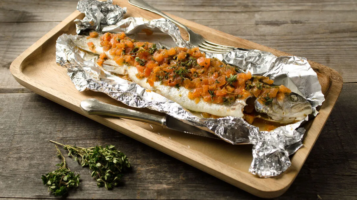 Heimischer Saibling mit saisonalen Kräutern in Folie