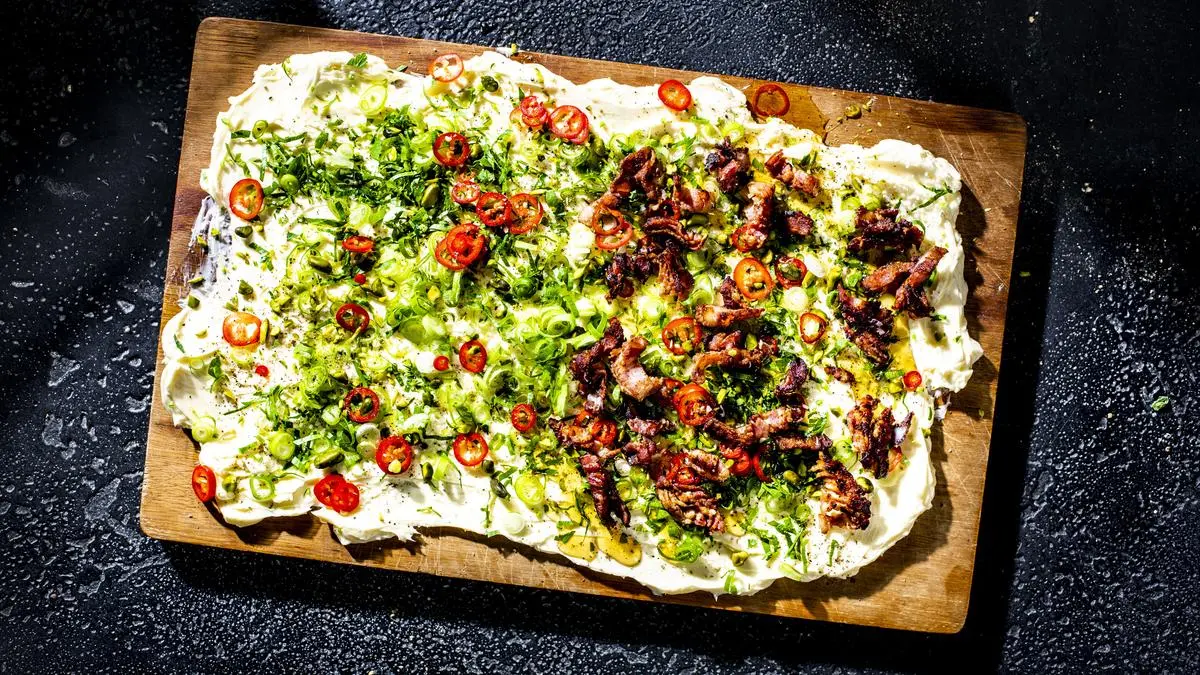Butter auf einem Brett verteilen. Frühlingszwiebel, Chili und Petersilie waschen und trocken tupfen. Frühlingszwiebel und Chili in feine Ringe schneiden, Petersilie fein hacken. Speck in Streifen schneiden und knusprig braten. Frühlingszwiebel, Chili, Petersilie und Pistazien auf der Butter verteilen. Auf die Hälfte der Butter zusätzlich Speck und Honig geben. Alles mit Salz und Pfeffer toppen und mit Brot servieren.
