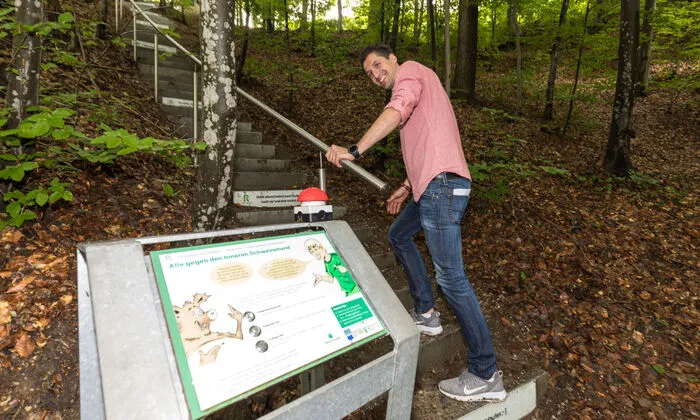 Um das Einhalten einer Geschwindigkeit geht es auch bei Station 3 - „Ein Lauf zum Zerkugeln“: Hier gibt eine Kugel das Lauftempo vor, die neben dem Weg eine 60 Meter lange Bahn hinunter rollt. Auch durchaus packbar, denke ich. Bei der praktischen Umsetzung lasse ich aber Graz-Tourismuschef Dieter Hardt-Stremayr den Vortritt. Der ist nämlich ebenfalls mit von der Partie und der schiebt hauptberuflich ja eher eine ruhige Kugel. Zumindest körperlich. In seiner Freizeit dürfte er allerdings öfter mal Jagd auf innere Schweinehunde machen, sonst würde er nicht freiwillig ein zweites Mal mit einer Kugel um die Wette rennen.