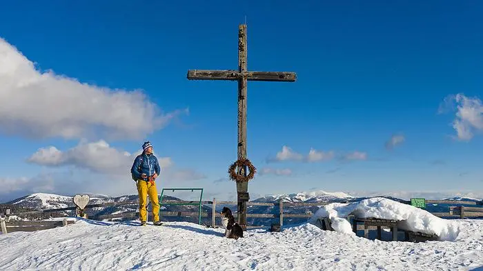 An der Hütte schwenken wir nach rechts und folgen der Markierung „Arnika-Jufen-Steig“ zum nahen Jufenkreuz. Zu Fuß oder auch mit den Schneeschuhen geht es bequem über sanfte Almhänge in südöstliche Richtung. Nach etwa 20 Minuten mündet der flache Steig in einen Hochwald. Vorbei an kräftigen Lärchen geht es in wenigen Schritten hinauf zum Kreuz. Wir genießen eine Gipfelrast, dann geht es zurück zum Ausgangspunkt in Grantsch.