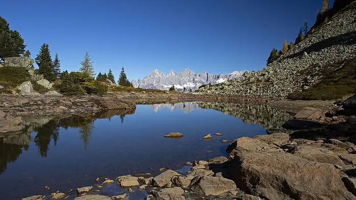 Das Wanderparadies Reiteralm zwischen Gasselhöhe, Rippetegg und dem Pichler/Schober bietet auf engstem Raum alles, was das Wanderherz höher schlagen lässt – Berge, Seen und eine unglaubliche Vegetation. Auf mehreren Etagen verteilt liegen fünf glasklare Bergseen, im mittleren spiegelt sich eindrucksvoll das Dreigestirn des Dachsteins. Aufgrund der idealen Lage wird der kleine Bergsee liebevoll Spiegelsee genannt.