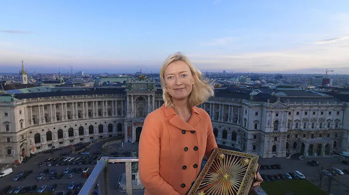 Johanna Rachinger auf einem Kran am Heldenplatz mit einem Faksimile des Evangeliars des Johannes von Troppau aus 1368, das als „Gründungscodex“ der Bibliothek gilt