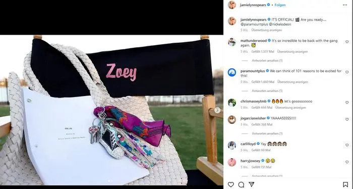 Die Hauptdarstellerin nahm die Fans im Verlauf der letzten Monate mit auf die Reise und teilte auf ihrem Instagram-Account diverse Einblicke in die Produktion. Spears postete ein Bild vom Script, das sich auf einem Regiestuhl mit der Aufschrift "Zoey" befindet. Zudem sind andere Stühle inklusive Namen der Clique zu sehen.