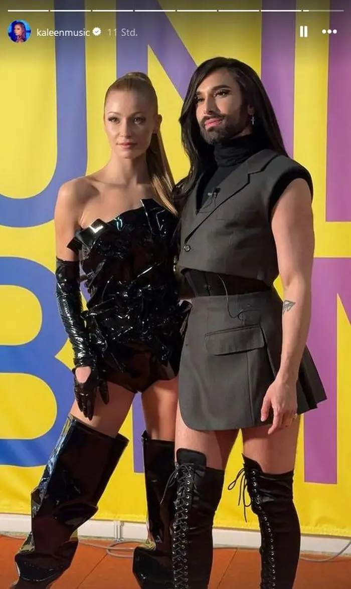 Vor Ort erhielt Österreichs ESC-Teilnehmerin überraschend auch prominente Unterstützung: Denn ein weiterer Schnappschuss zeigt sie mit der ehemaligen Gewinnerin Conchita Wurst. Hier stellt Kaleen auch ein weiteres mögliches Bühnenoutfit zur Schau: Es handelt sich um einen Body in schwarzer Lederoptik mit passenden Handschuhen und Stiefeln.