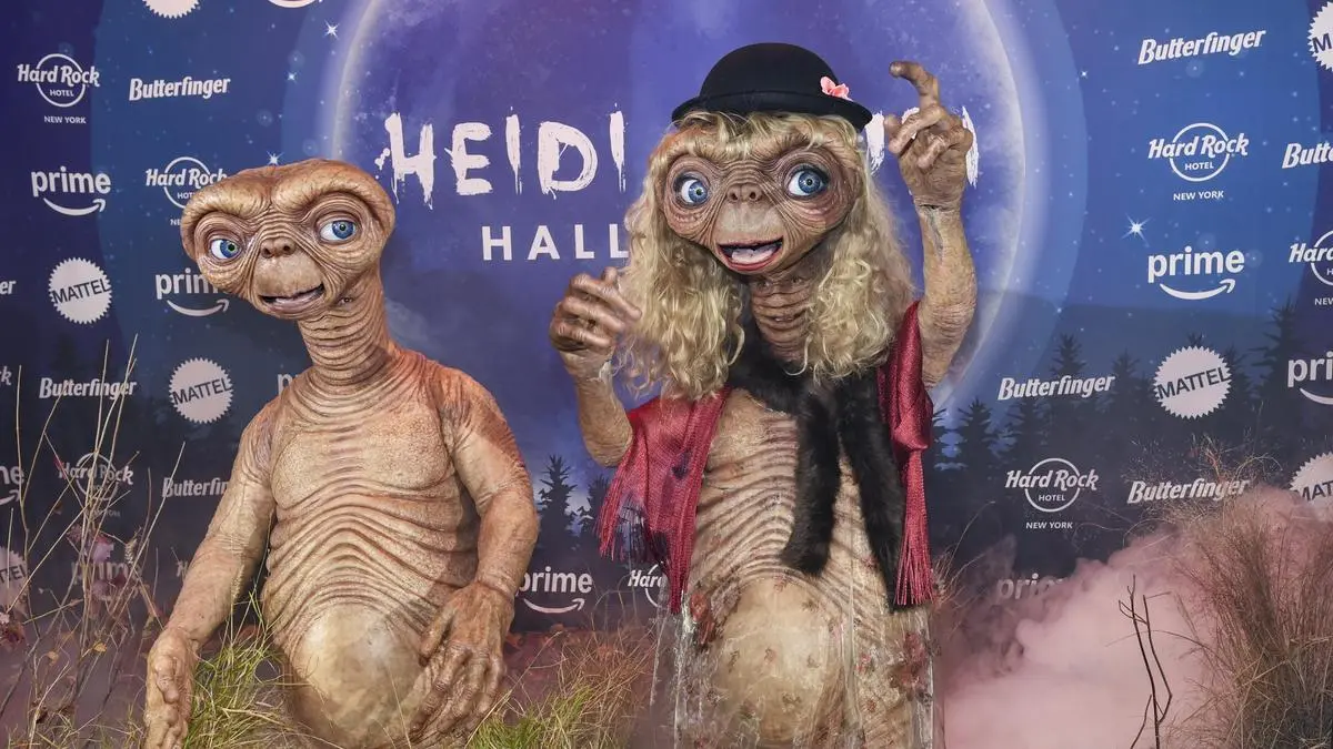 Heidi Klum hat ihrem Spitznamen als „Königin von Halloween“ alle Ehre gemacht - und ist bei ihrer berühmten jährlichen Party in New York als der Außerirdische E.T. ins Rampenlicht getreten. Zusammen mit Ehemann Tom Kaulitz - der bis auf einige Accessoires dasselbe Outfit trug - zeigte die Deutsche eine leuchtende Fingerspitze, wie das Vorbild aus dem Film-Klassiker von Steven Spielberg aus dem Jahr 1982.
