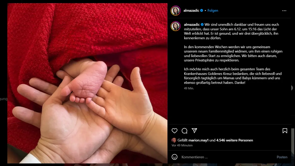 Dazu schreibt die Politikerin: „Wir sind unendlich dankbar und freuen uns euch mitzuteilen, dass unser Sohn am 6.12. um 15:16 das Licht der Welt erblickt hat. Er ist gesund, und wir drei überglücklich, ihn kennenlernen zu dürfen.“ Sohn Nummer 2 ist auch Baby Nummer 2, das sie während ihrer Zeit als Justizministerin bekommt. Alma Zadić hatte im Jänner 2021 ihr erstes Kind zur Welt gebracht.