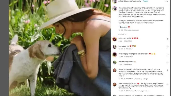 Herzogin Meghan hat mit einem emotionalen Instagram-Beitrag ihre Trauer über den Tod ihres Hundes Guy geteilt. „Ich habe zu viele Tränen geweint, um sie zu zählen - diese Art von Tränen, die einen dazu bringen, sich in der absurden Hoffnung unter die Dusche zu stellen, dass das fließende Wasser auf dem Gesicht irgendwie dafür sorgt, dass man sie nicht spürt“, schrieb die 43-Jährige zu einem mit Klaviermusik unterlegten Video.
