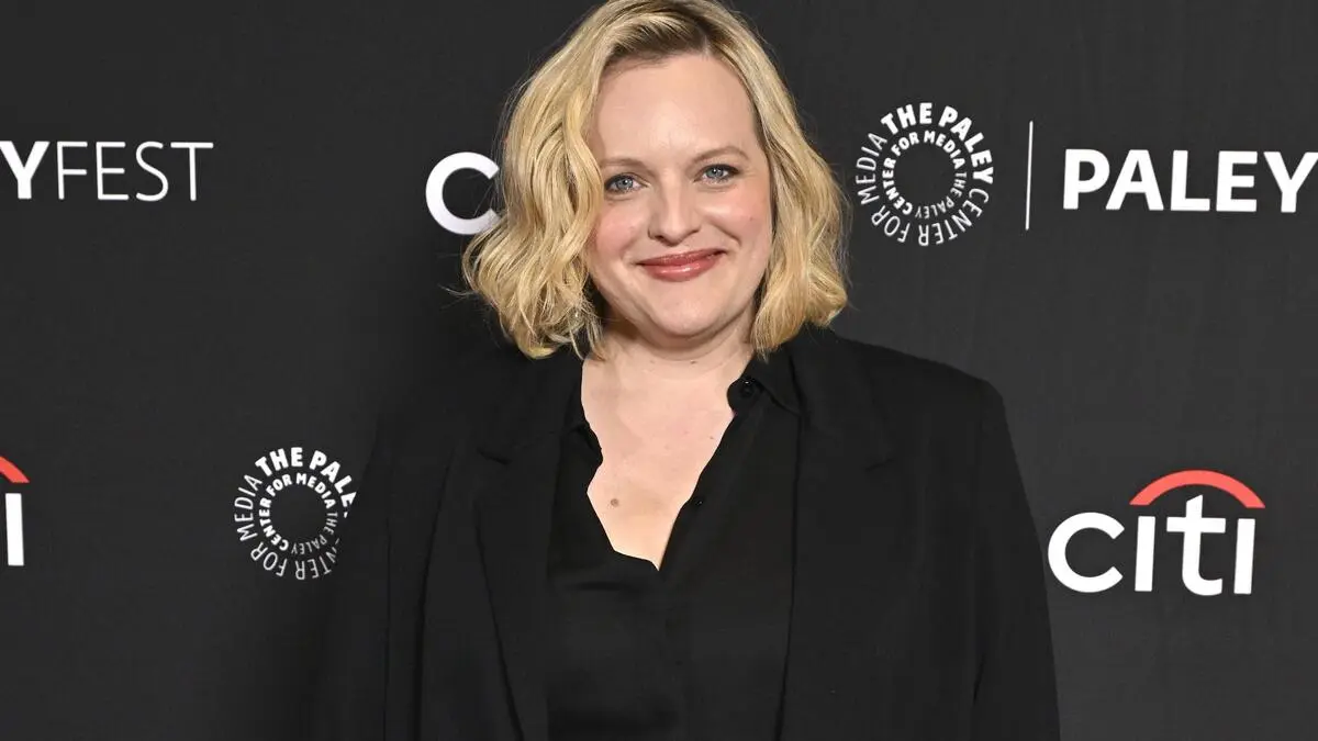 Das Bild zeigt Elisabeth Moss mit schulterlangem, welligem, blondem Haar, die auf einem schwarzen Hintergrund mit Logos von „PaleyFest“ und „Citi“ posiert. Sie trägt ein schwarzes Outfit und lächelt freundlich in die Kamera.  | Elisabeth Moss ist Mama geworden