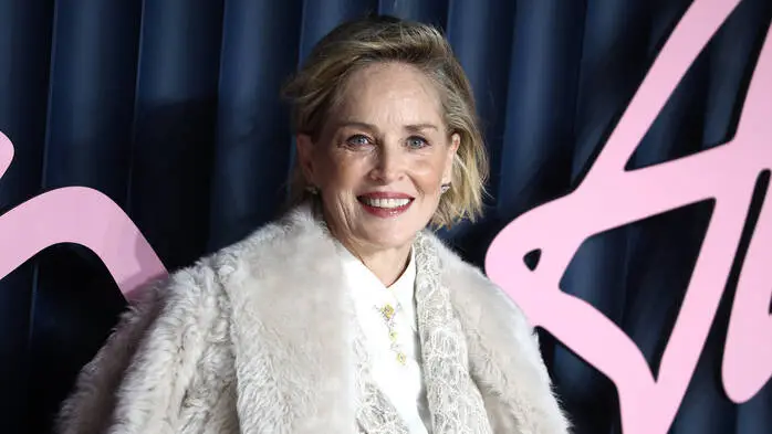 Dieses Bild zeigt die Schauspielerin Sharon Stone. Sie blickt direkt in die Kamera und trägt roten Lippenstift und einen weißen Mantel.