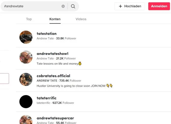 Sucht man auf TikTok nach dem Original-Account von Andrew Tate, findet man eine Vielzahl von Fake-Profilen, die seine Videos ihrerseits wieder weiter verbreiten. Solche "Copycat"-Accounts sind auf TikTok gemäß der Community-Richtlinien der Plattformen übrigens explizit verboten - ebenso wie Frauenfeindlichkeit.