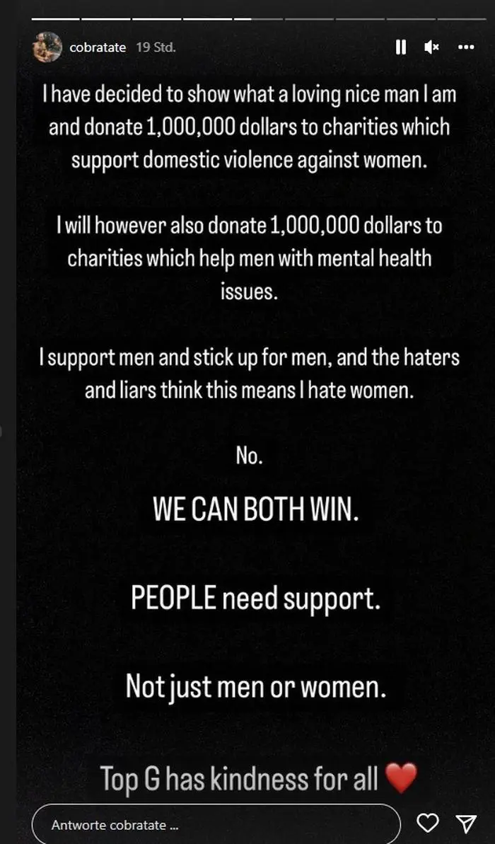 Tate selbst hat heute über seine Instagram-Story bekannt gegeben, demnächst große Summen an Wohltätigkeitsorganisationen zu spenden. Er wolle zeigen, dass er ein liebender und netter Mann sei. In seiner Story schreibt er dazu: "I will donate 1,000,000 dollars to charities which support domestic violence against women". Ins Deutsche übersetzt heißt das, dass er an Organisationen spenden wolle, die häusliche Gewalt gegen Frauen unterstützen. Gemeint ist vermutlich, dass er Organisationen unterstützen will, die sich gegen häusliche Gewalt bei Frauen einsetzen.