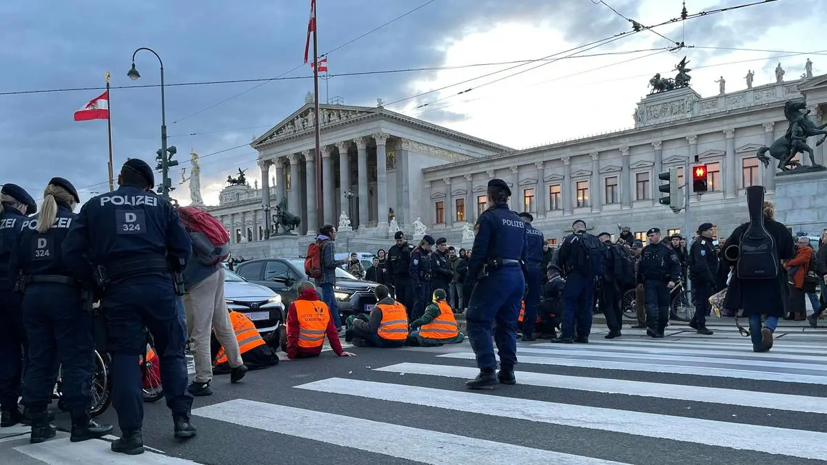 Beim Parlament werde heute das sogenannte „Zukunftsbudget“ besprochen, hieß es von der „Letzten Generation“. „Eine Zukunft haben wir aber nur, wenn die Politikerinnen und Politiker endlich ihrer Verantwortung nachkommen und die Empfehlungen des Klimarates umsetzen, anstatt von ‚Akkuseitenschneidern‘ für die Polizei zu fantasieren“, sagte Sprecherin Laila Fuisz.
