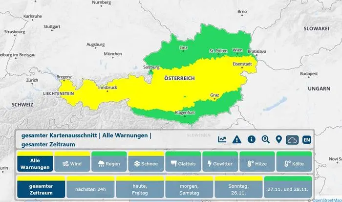 Das Wochenende bringt Kälte und Schnee nach Österreich. Die Meteorologinnen und Meteorologen der Geosphere (ehemals Zamg) haben am Freitag sogar eine Wetterwarnung herausgegeben. Denn der stürmische Nordwestwind auf den Bergen sorgt dafür, dass sich kalte und feuchte Polarluft und damit Wolken und Niederschlag an der Alpennordseite staut. Besonders betroffen sind die Gebiete von Vorarlberg, vom Bregenzer Wald, bis ins steirische Salzkammergut und ins Mostviertel. „Hier schneit es bis Sonntagabend teils anhaltend und kräftig“, sagt Meteorologe Thomas Turecek. Wobei die Schneefallgrenze von anfangs 1000 Metern am Freitag auf bis zu 300 Meter absinkt. Der meiste Schnee wird aber in den Bergen fallen, bis zu 50 Zentimeter sind für das Wochenende vorhergesagt. Im Hochgebirge steigt die Lawinengefahr.