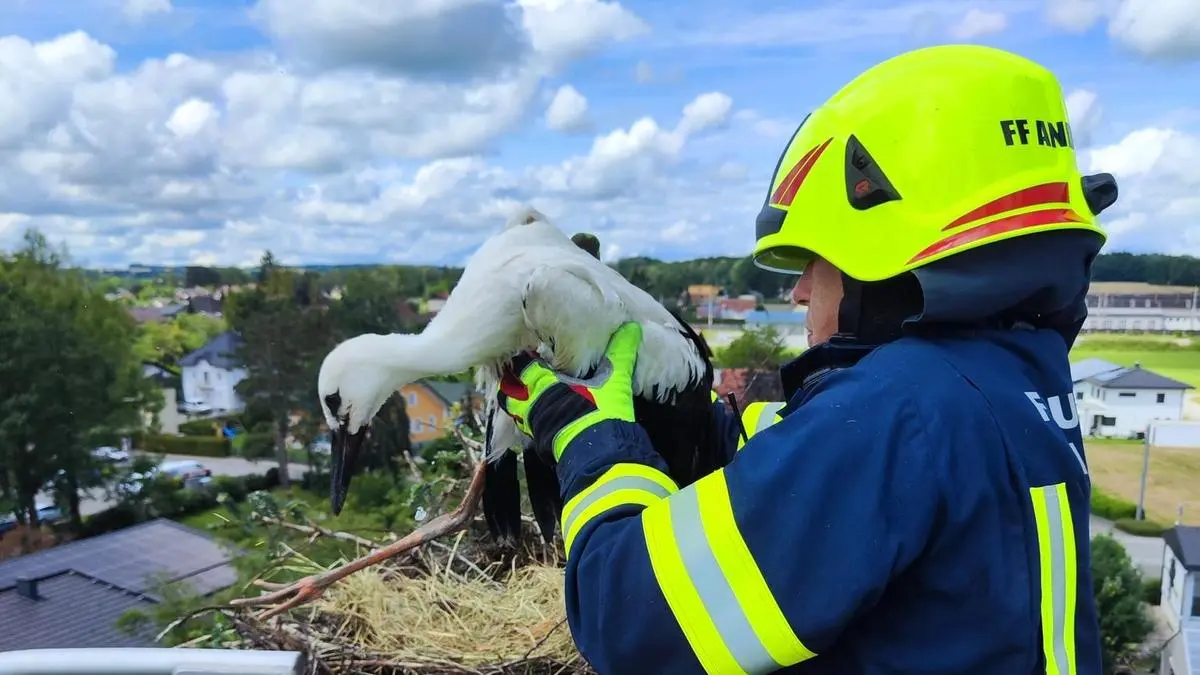 Feuerwehr in Oberösterreich rettete jungen Storch und sein „Zuhause“