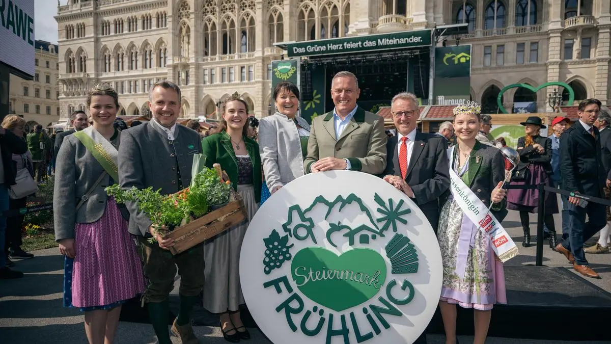 Die grünen Herzen waren schon von weitem zu erkennen, wenn man sich der Bühne am Wiener Rathausplatz nähert. Der Musikverein Turnau und die Werkskapelle Böhler stimmten den Takt an, die frischen Wagner-Brezen lagen bereit und dem neuen steirischen Landeshauptmann Mario Kunasek (FPÖ) gelang der Bieranstich mit zwei Schlägen. Das kann nur eines bedeuten: Es ist Steiermark-Frühling. Neben der Showbühne steht ein gläsernes Kochstudio, in dem Sternekoch Heinz Reitbauer erstmals das Catering macht, rundherum säumen insgesamt 89 Aussteller das Gelände und bieten alles feil, was die Steiermark so besonders macht: von Roggenen Krapfen bis zur Brettljause im Buschenschank.
