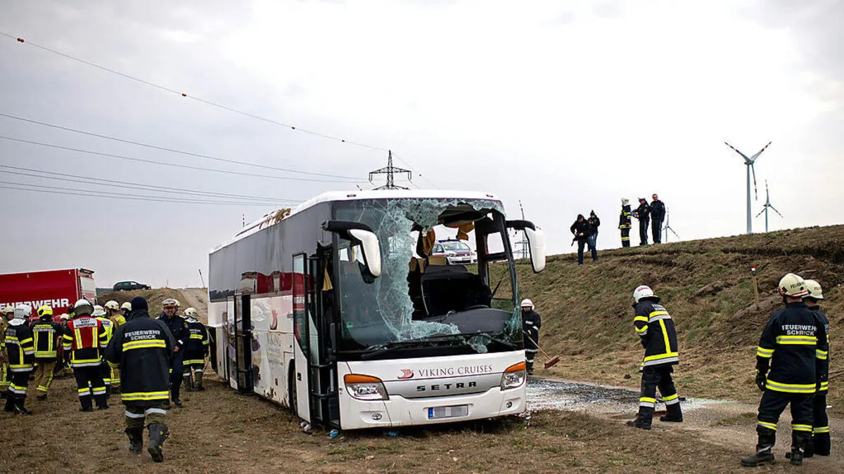 Ein Autobus ist Sonntagnachmittag im Weinviertel auf der B7 auf Höhe Schrick eine Böschung sieben Meter tief hinunterstürzt. Bei den Passagieren handelt es sich um Musiker der Tschechischen Philharmonie.