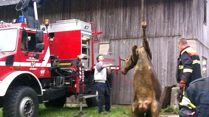 Eine Kuh war durch den Boden in eine Güllegrube gestürzt. Sie wurde mithilfe eines Krans von der Feuerwehr aus der Jauchegrube gerettet.