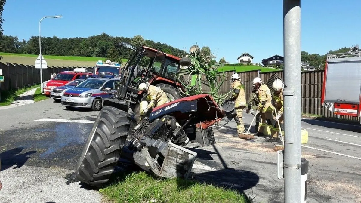 Beim Zusammenstoß mit einem Lastwagen ist am Donnerstagnachmittag in Hallwang ein Traktor in zwei Hälften geteilt worden. Der mit Sand beladene Lkw kippte dabei um, der Lenker wurde eingeklemmt.