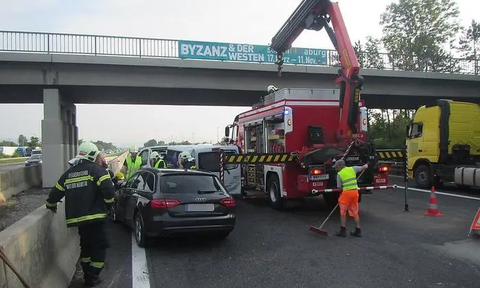 Ein Unfall mit mehreren Fahrzeugen hat am Montag auf der Südautobahn (A2) Richtung Wien bei Wiener Neustadt einen bis zu zwölf Kilometer langen Stau verursacht. Acht Kfz und mehr als ein Dutzend Personen waren laut Feuerwehr beteiligt, es gab fünf Verletzte. Ein Auto wurde bei dem Unfall auf die Betonleitwand geschleudert und blieb dort hängen. Verzögerungen von rund zwei Stunden waren die Folge.