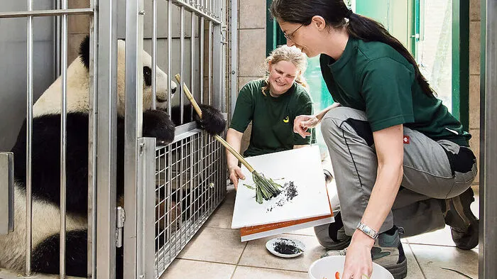Das Panda-Weibchen "Yang Yang" im Tiergarten Schönbrunn betätigt sich jetzt als Malerin. Die mit einem Bambus-Pinsel angefertigten "Kunstwerke" sind Teil eines Crowdfunding-Buchprojekts über die Geschichte der Großen Pandas im Wiener Zoo.