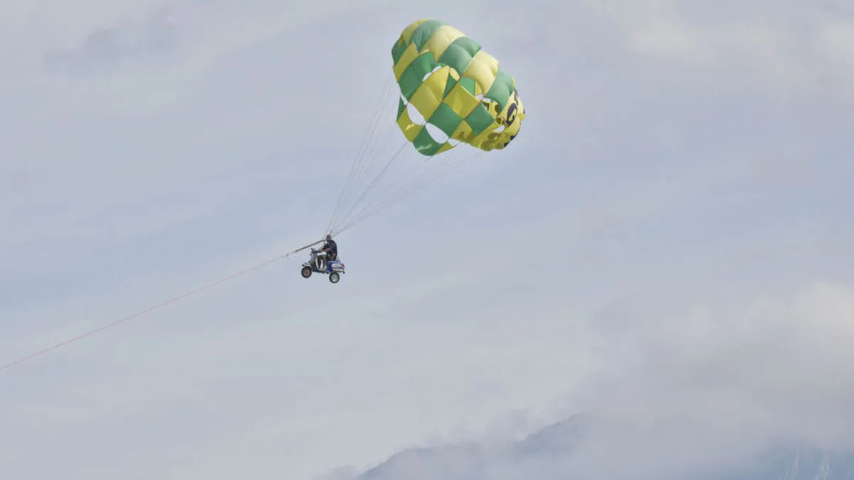 Stuntman Günter Schachermayr stieg mit einer Vespa, die an einem Drachen fixiert war, 75 Meter in die Luft.