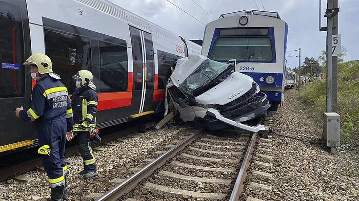Kleinlastwagen von zwei Zügen zermalmt