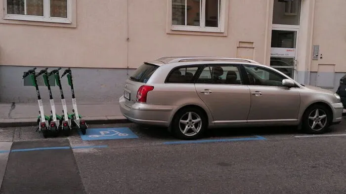 In Wien wurden eigene Parkplätze für E-Scooter geschaffen, benutzt werden sie meistens von Autos. Es ist nicht das einzige Problem mit den neuen Regelungen.