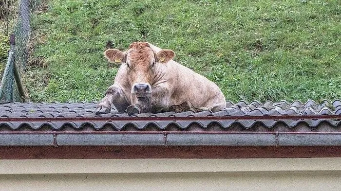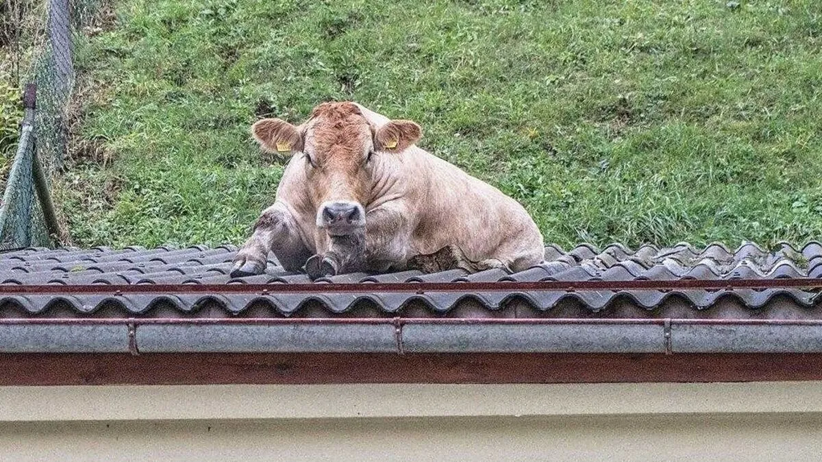 Im niederösterreichischen Bezirk Thomasberg rutschte eine Kuh über eine steile Böschung auf ein Garagendach und brach ein.