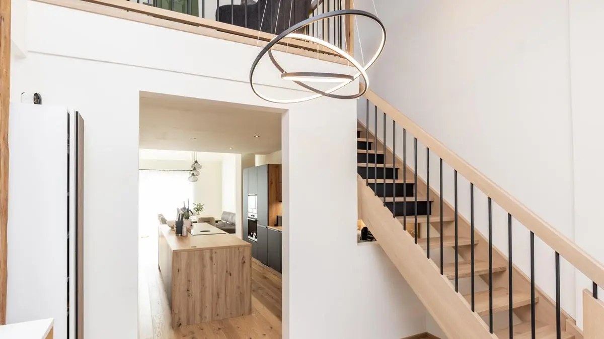 Straßenseitig fallen einem sofort die diagonal eingesetzten Holzpaneele in der weißen Putzfassade des Gebäudes auf. „Sie sind aus vorgegrautem Lärchenholz gefertigt und werten das äußere Erscheinungsbild optisch auf“, erklärt Leitner. Dieses Spiel mit den Holzelementen zieht sich auch in den Stiegenaufgängen weiter. Die Zwischenräume der Holzlatten lassen nicht nur reichlich Tageslicht herein, sondern sorgen auch, je nach Tageszeit, für außergewöhnliche Lichtspiele und schaffen somit eine Atmosphäre, die zugleich Schutz als auch Leichtigkeit vermittelt.