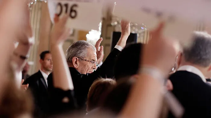 Die Stimmung bei der Wahlfeier der Grünen ist gut. Van der Bellen erinnert - wieder einmal - daran, dass es "arschknapp" werde. Und, dass es "Spitz auf Knopf" stünde.