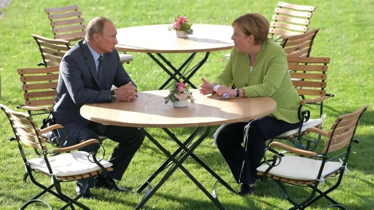 Kanzlerin Angela Merkel und Präsident Wladimir Putin auf Schloss Meseberg