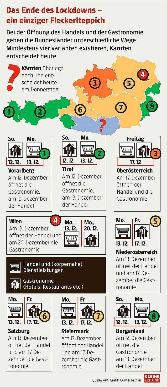 2 Fleckerlteppich. Vor zwei Wochen ging Österreich kollektiv in den Lockdown, nun macht jedes Bundesland, was es will. Die regionale Differenzierung ist nicht epidemiologisch begründet. Obwohl Vorarlberg und Tirol die höchsten Inzidenzen bzw. den höchsten Covid-19-Belag auf Intensivstationen aufweisen, öffnen beide Bundesländer umgehend: am Sonntag Gastronomie und Hotellerie, am Montag Handel und Dienstleister. Wien und die Steiermark stehen epidemiologisch viel besser da, lassen aber Vorsicht walten und sperren die Gastronomie und Hotels erst am 17. Dezember (Steiermark) bzw. am 20. Dezember (Wien) auf. Der steirische Landeshauptmann Hermann Schützenhöfer geht auf Nummer sicher. Kärnten ist noch unentschlossen, heute will Landeshauptmann Peter Kaiser nach Beratungen mit Experten entscheiden.
