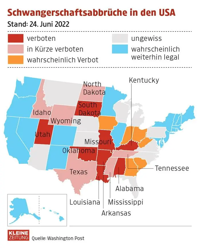 In den USA gibt es kein landesweites Gesetz, das Abtreibungen erlaubt oder verbietet. Schwangerschaftsabbrüche waren bisher aber mindestens bis zur Lebensfähigkeit des Fötus erlaubt – heute etwa bis zur 24. Woche. Zum Vergleich: In Österreich werden Schwangerschaftsabbrüche bis zur 14. Woche durchgeführt.
