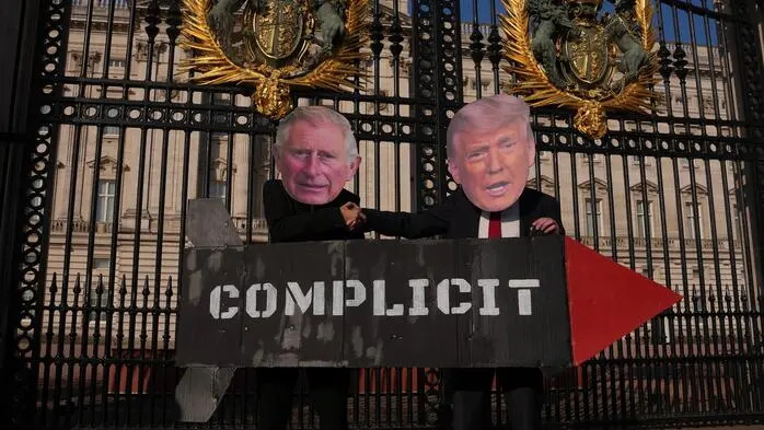 Bereits im Vorfeld des Staatsbesuchs verliehen Demonstranten vor dem Buckingham Palace in London ihrem Unmut über die Visite