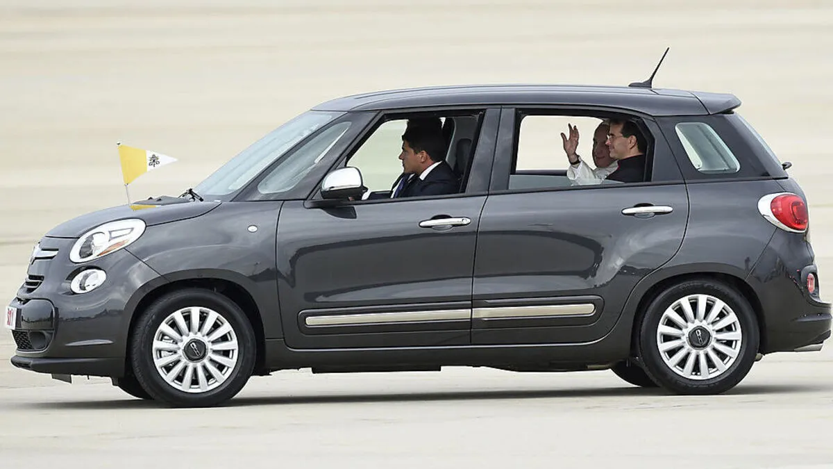 Papst Franziskus hat mit seinem Kleinwagen in Washington für Aufsehen gesorgt. Nach der Ankunft auf dem Militärstützpunkt Andrews Air Force Base bestieg er einen Fiat 500L, um die Strecke zu seinem Quartier in der Vatikanbotschaft zurückzulegen.