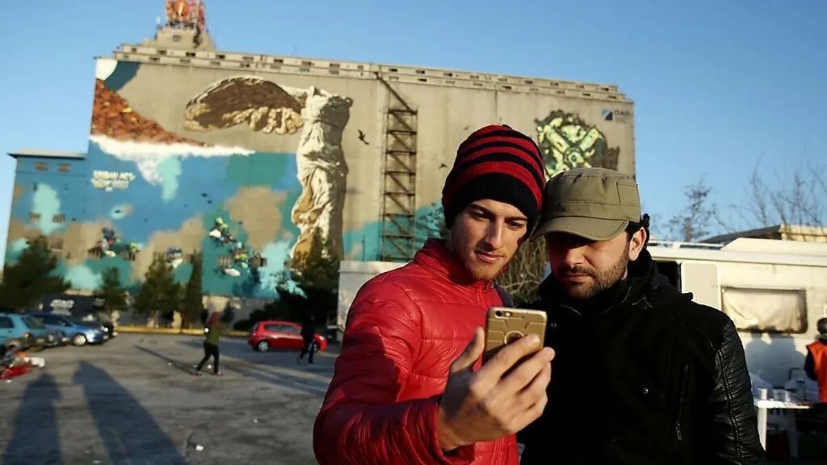 Afghanische Flüchtlinge machen nach ihrer Ankunft in Piräus ein Selfie