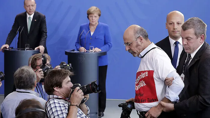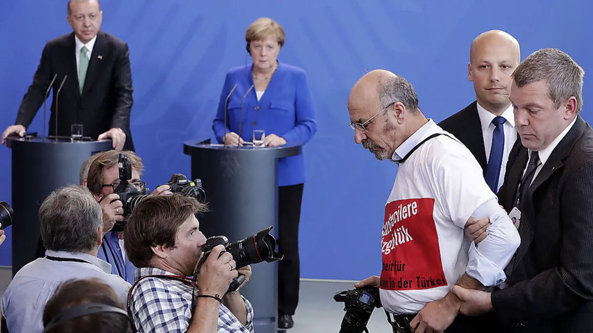 Der Mann trug ein T-Shirt mit der Aufschrift: "Freiheit für Journalisten in der Türkei". Der Mann wurde vor laufenden Kameras bei der Pressekonferenz von Angela Merkel und Recep Tayyip Erdogan abgeführt.