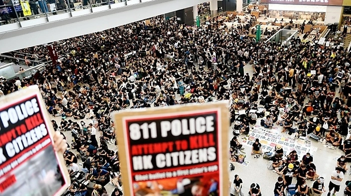 Wegen der anhaltenden Proteste der Demokratie-Bewegung hat Hongkongs Flughafen am Montag sämtliche Abflüge für den Rest des Tages gestrichen. Tausende Demonstranten versammelten sich in der Abflugs- und Ankunftshalle, um gegen Regierung und Polizeigewalt zu protestieren.
