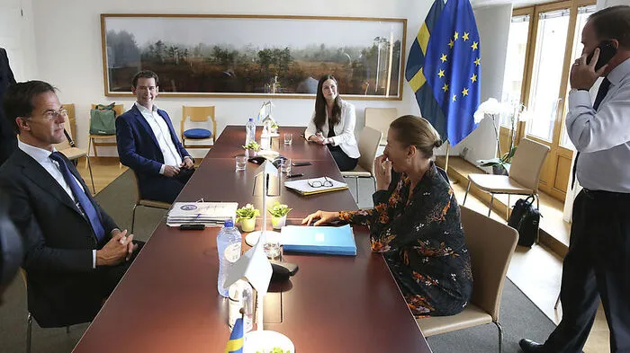 Mark Rutte, Sebastian Kurz,  Sanna Marin, Stefan Lofven und Mette Frederiksen bei einem bilateralen Treffen