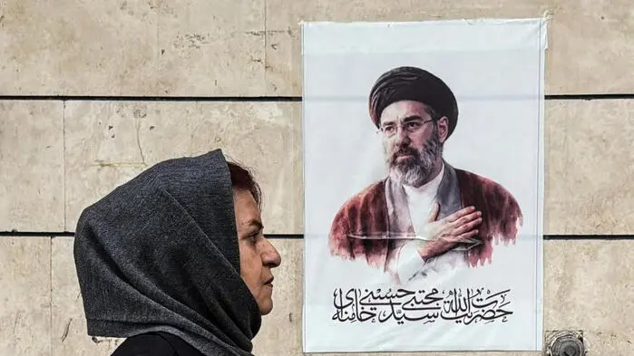 Eine iranische Frau mit Kopftuch spaziert an einem Bild vorbei, das den neuen obersten Führer Mojtaba Khamenei zeigt.